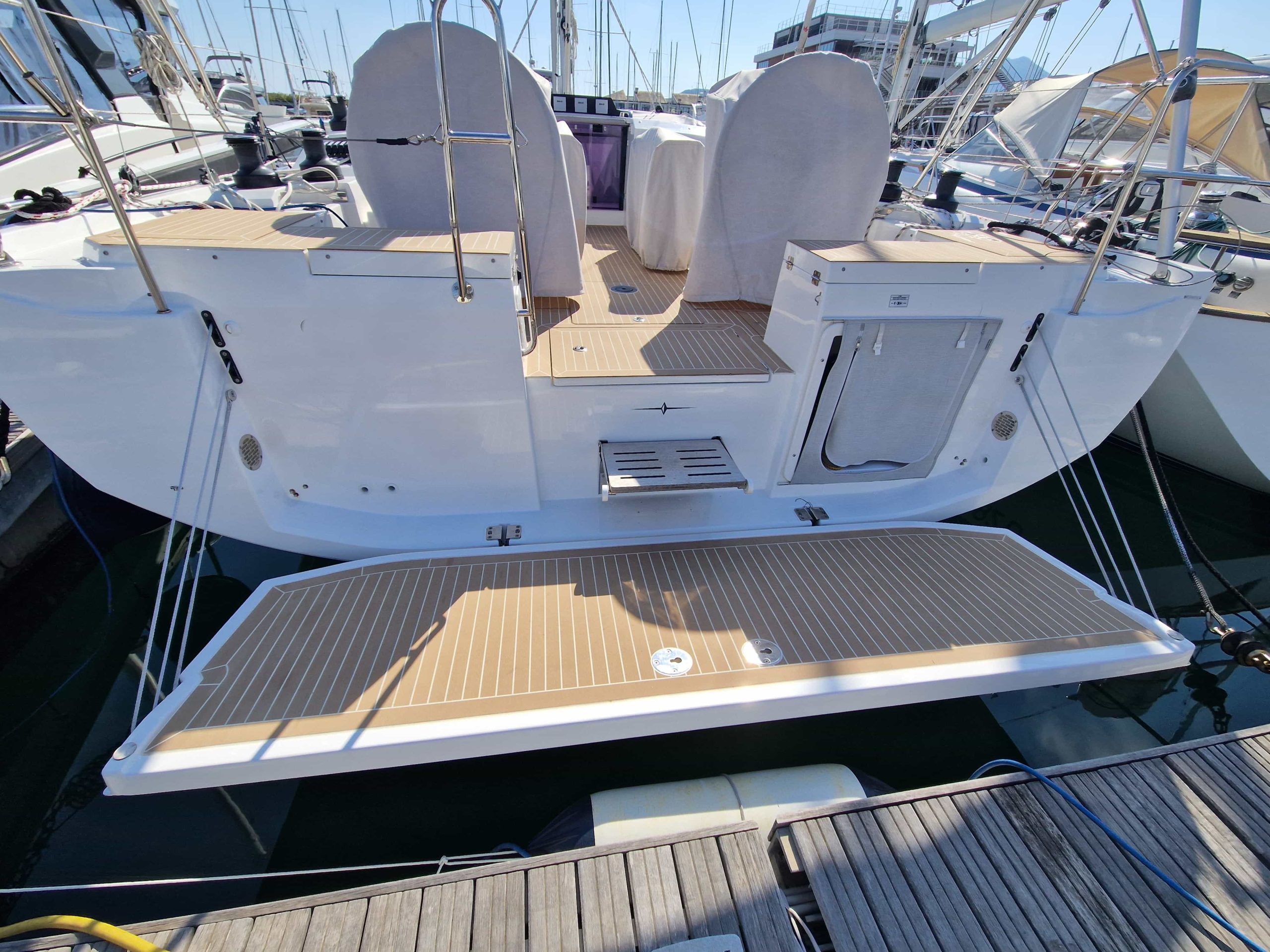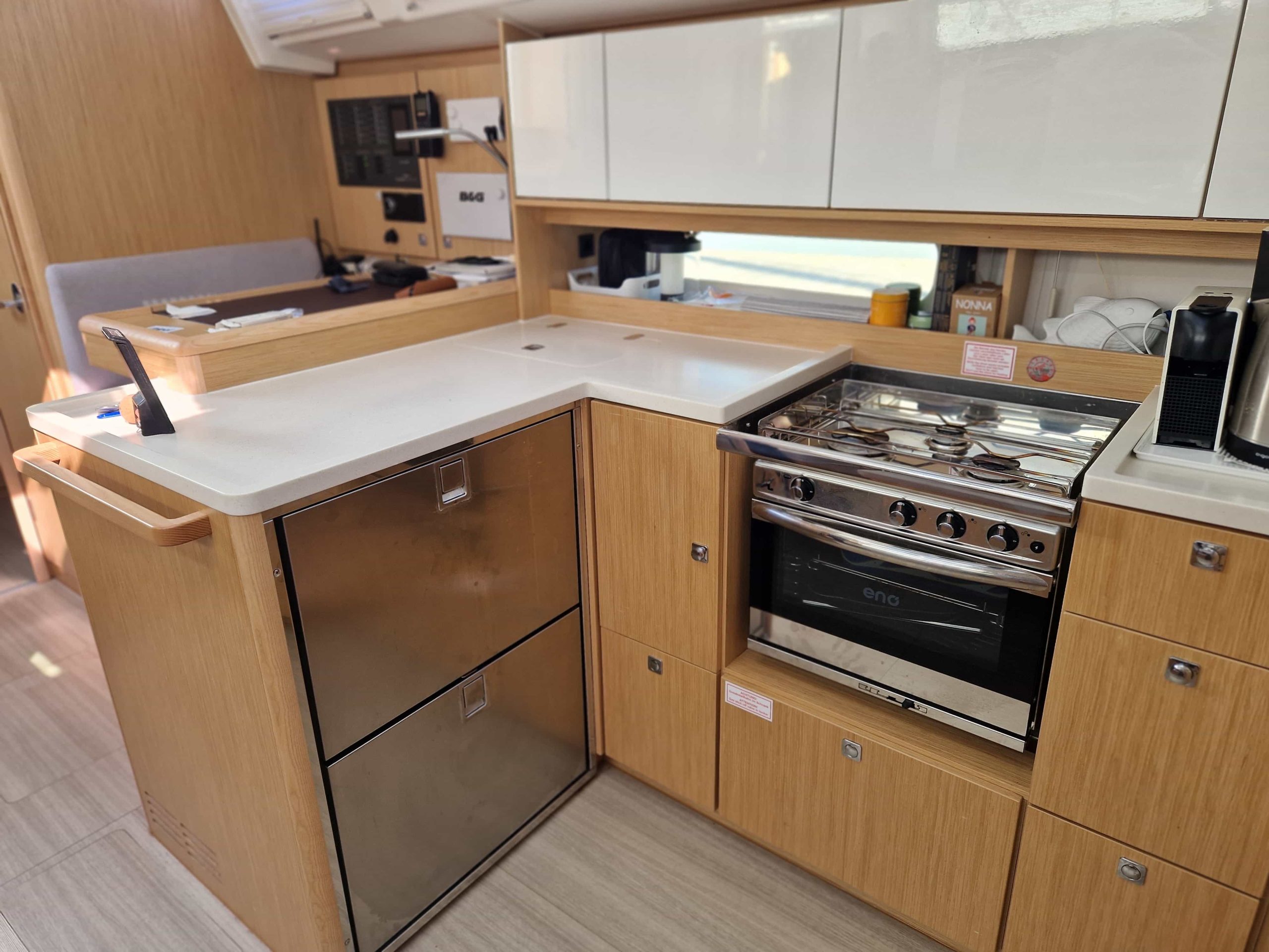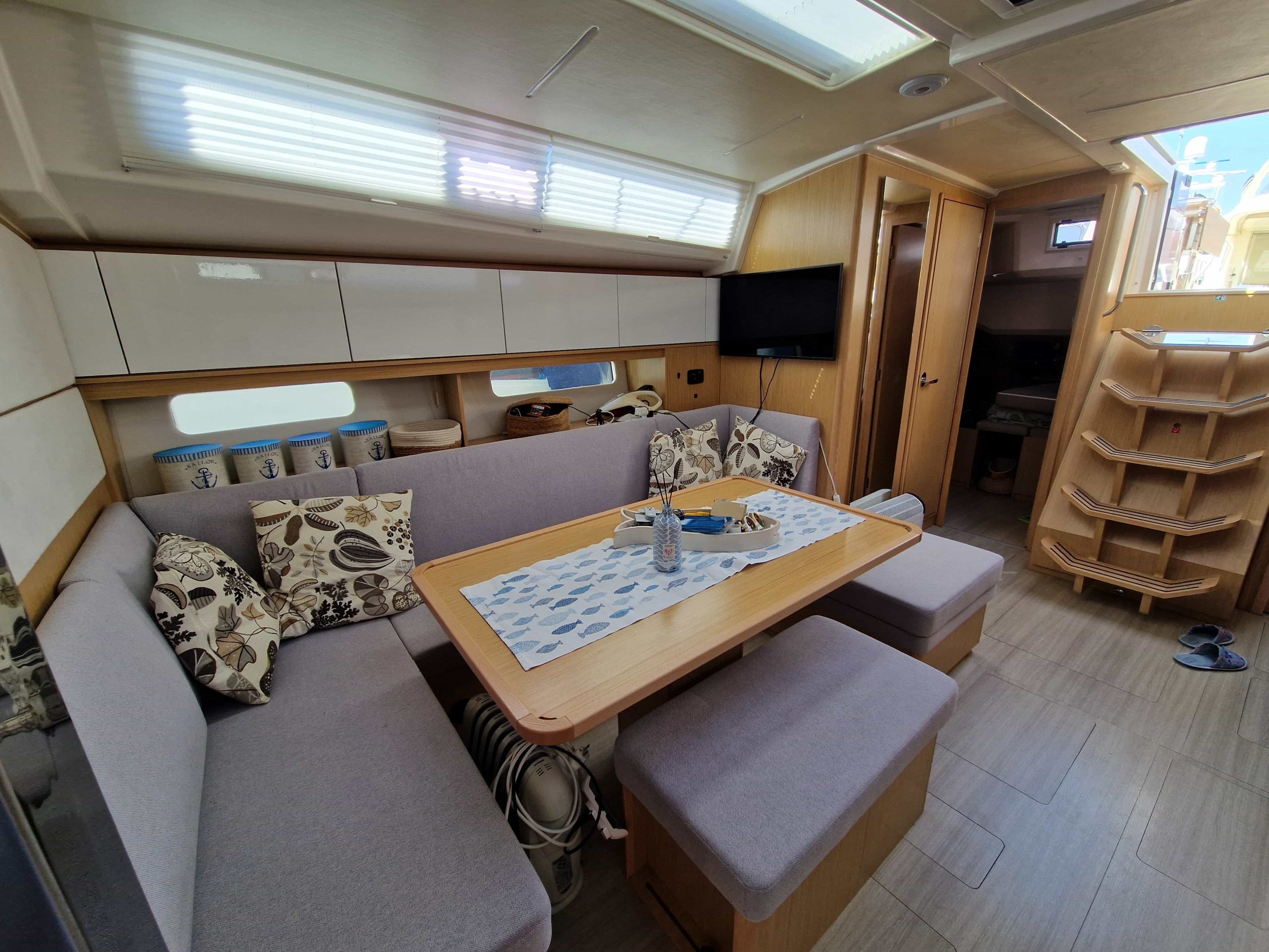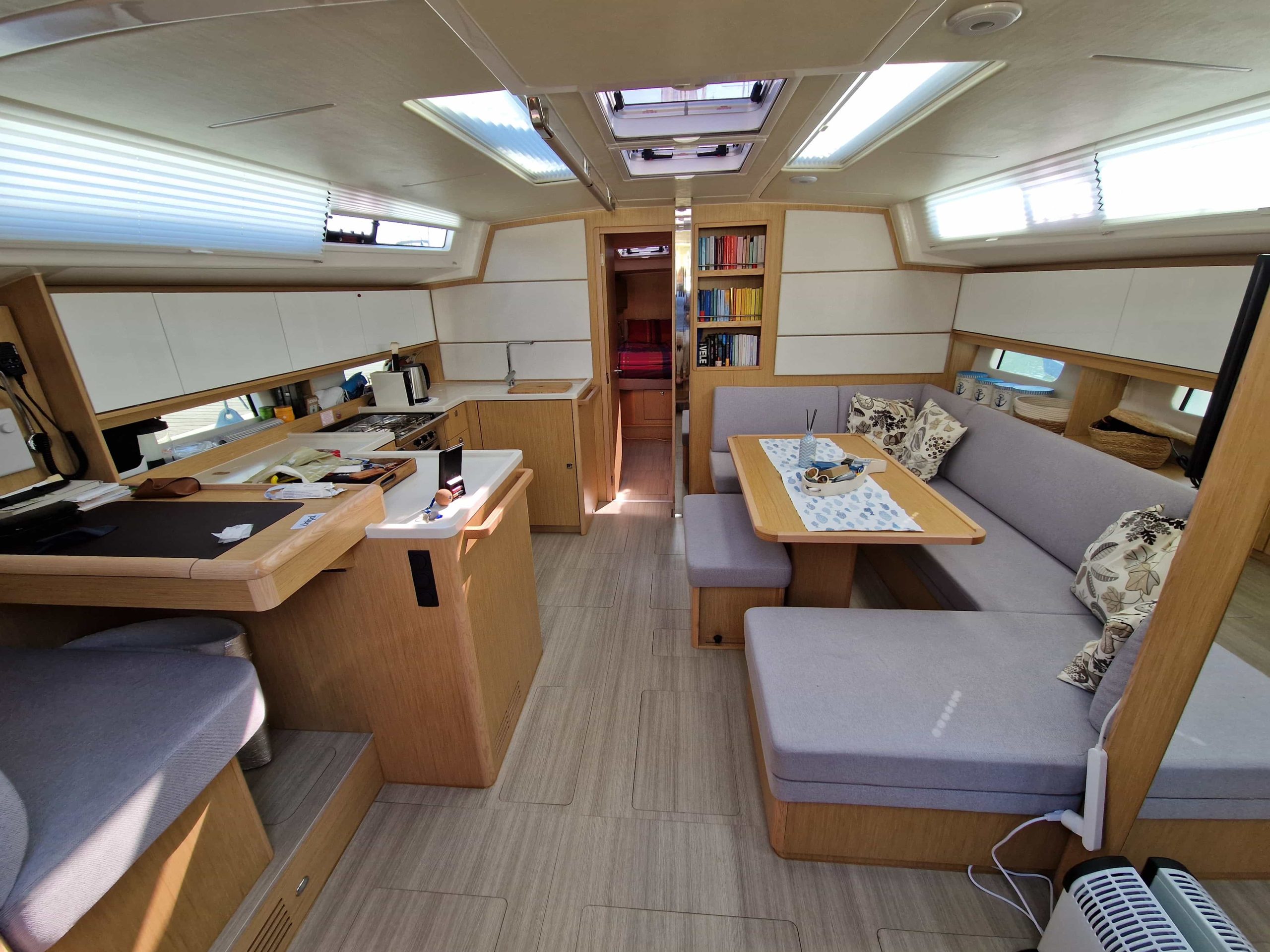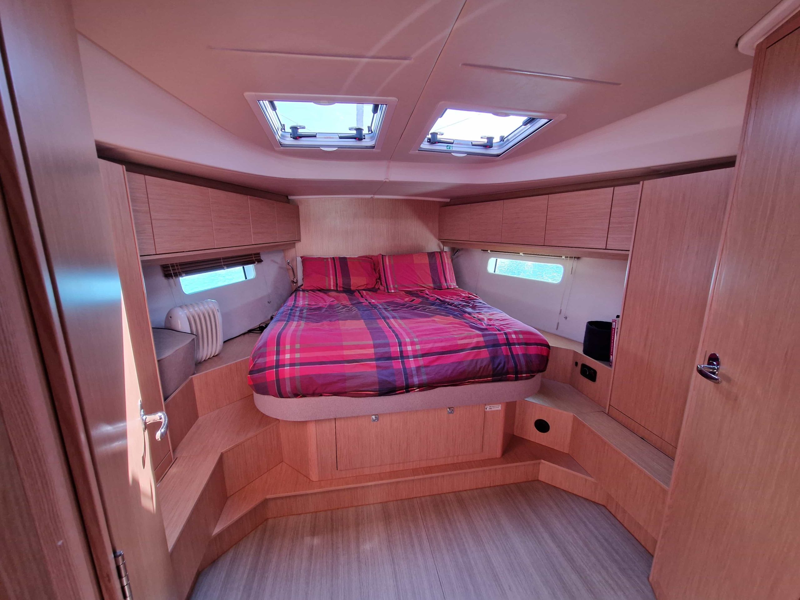 Questa unità in particolare ha un layout con 3 cabine matrimoniali + 3 bagni, ampia dinette di fronte alla cucina disposta ad U super accessoriata con frigo aggiuntivo organizzato in due cassetti, lavastoviglie per 6 persone, forno e fuochi a gas, notevole altezza interna in ogni punto ed un ottima luminosità grazie alle ampie finestrature, legni chiari per un ambiente elegante e moderno, corrispondente al nuovo