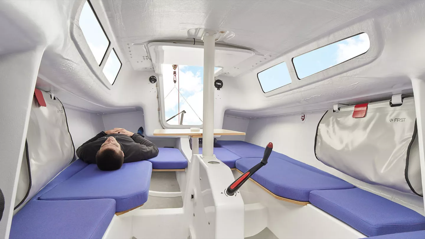 The First 24 SE is an easy-to-trail and rig, even with a short-handed crew of two. Featuring a lifting keel with a lead bulb and a powerful sail plan, she has a displacement of 1,550 kg and a carbon mast. While the interior is minimalist, she is equipped with four adult berths. This boat is perfectly suited for day sailing but is primarily designed for racing, boasting a well-established one-design circuit.